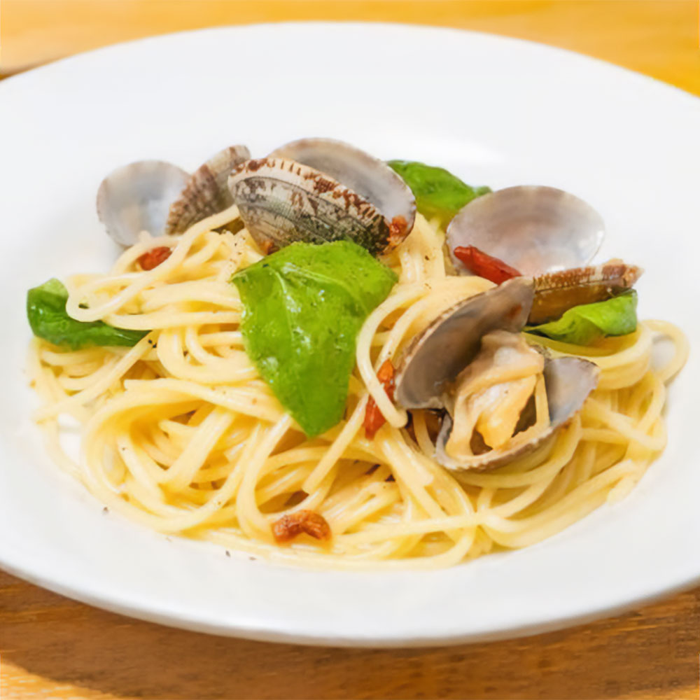 ボンゴレビアンコはイタリアを代表するシーフードパスタの一つ。新鮮なアサリとガーリックを効かせたオリーブオイルの香りが食欲をそそります。アルデンテに仕上げたラ・モリサーナ社のスパゲッティが、口の中でふんわりと広がり、アサリの旨み、白ワインの香り、オリーブオイルの風味が絶妙に調和しています。香り高いガーリックと唐辛子が加わり、ピリッとした辛味が効いて、味わいがより深まります。海の恵みとオリーブオイルの濃厚なコクがたまらない一品で、シーフード好きな方には、是非ともお勧めしたいパスタ料理です。