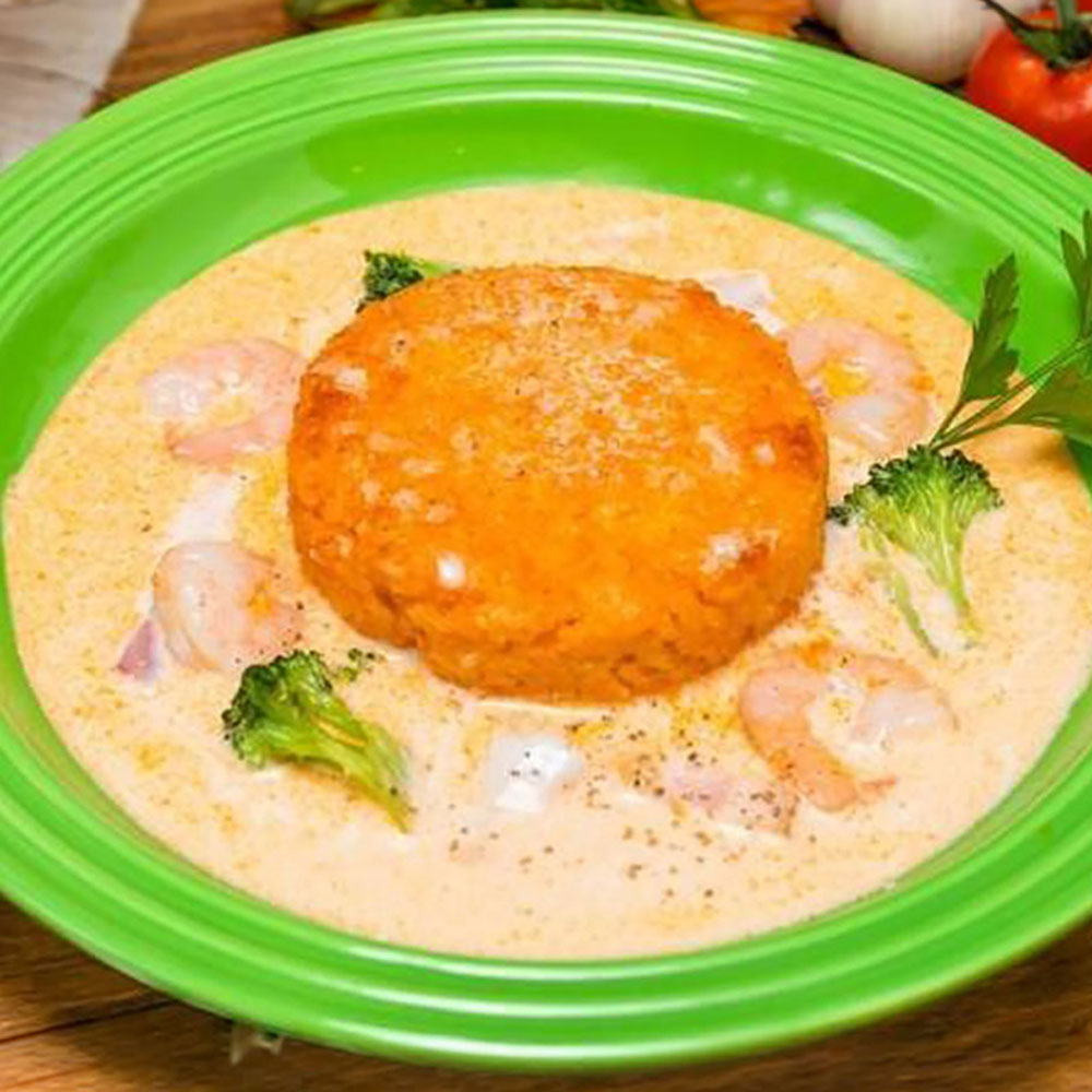 エビやカニなどの旨味を濃縮に抽出したスープです。当店のリゾットは、デリバリー向けに開発されたリゾット米を使用しております。チーズで焼き固めたライスボールをお客様自身で崩して混ぜ、お米にスープを馴染ませてからお召し上がりください。