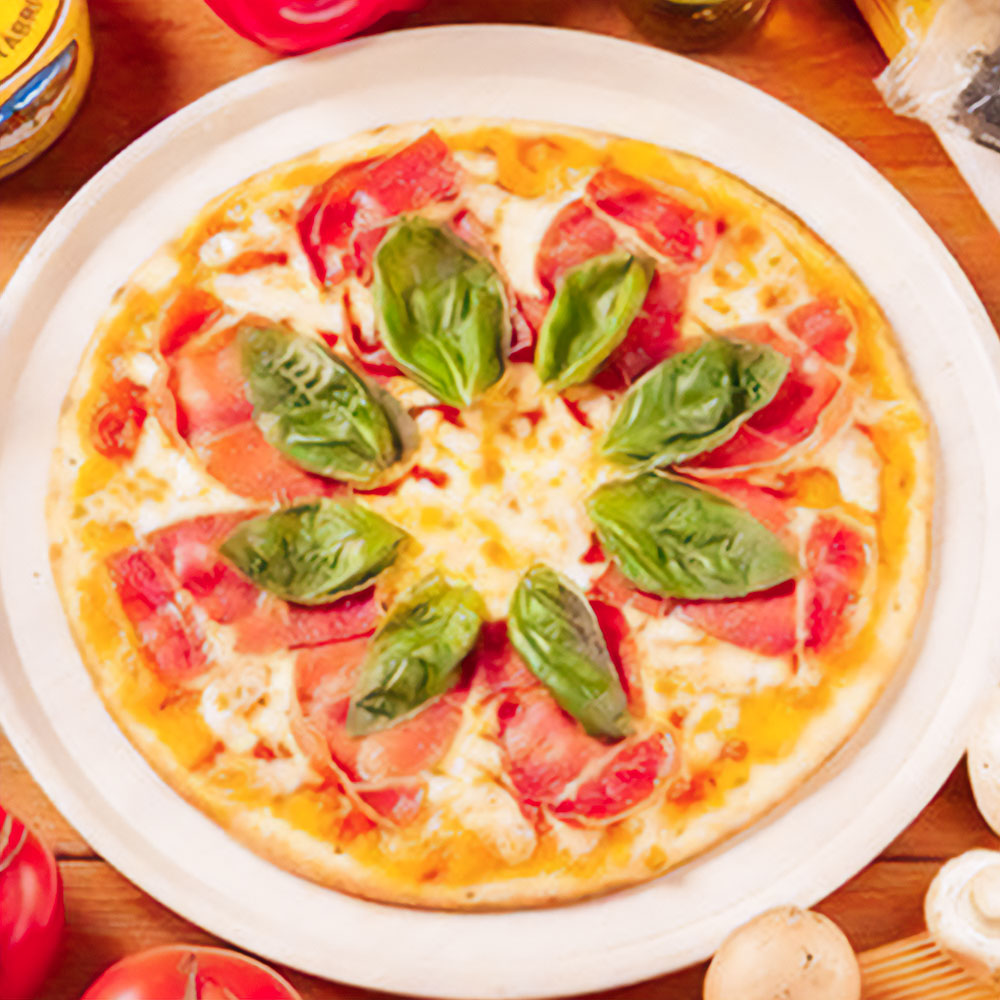 新鮮な生ハムとバジルが薫る、さっぱりいただける一品です。生ハム、バジル、特製トマトソース、モッツァレラ、ゴーダチーズをトッピングしています。